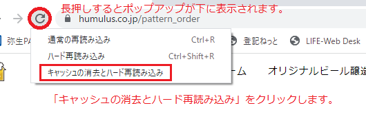 「キャッシュの消去とハード再読み込み」を押してください。そうするとキャッシュがクリアされます。